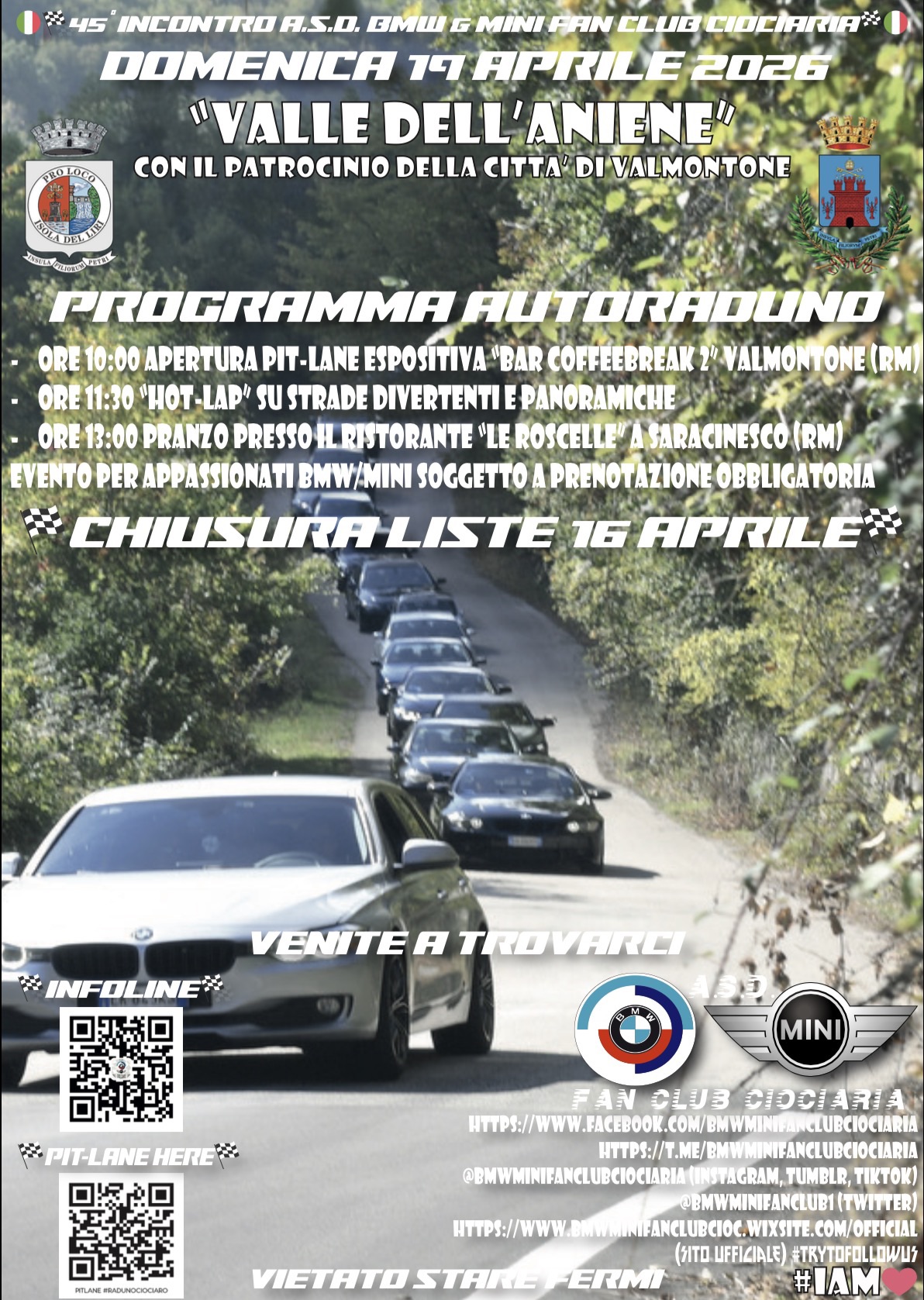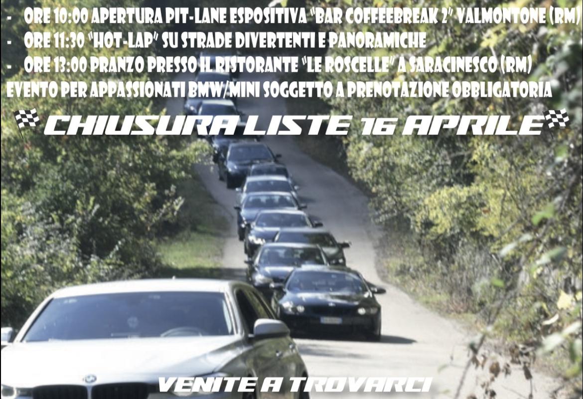 - CHIUSURA LISTE PRENOTAZIONI: 16 APRILE 2026. Evento riservato ai soci ed aperto a tutti, anche a semplici curiosi ed appassionati. Per tutti i dettagli, consultate la locandina e iscrivetevi GRATIS a tutti i canali social del BMW & Mini Fan Club Ciociaria: